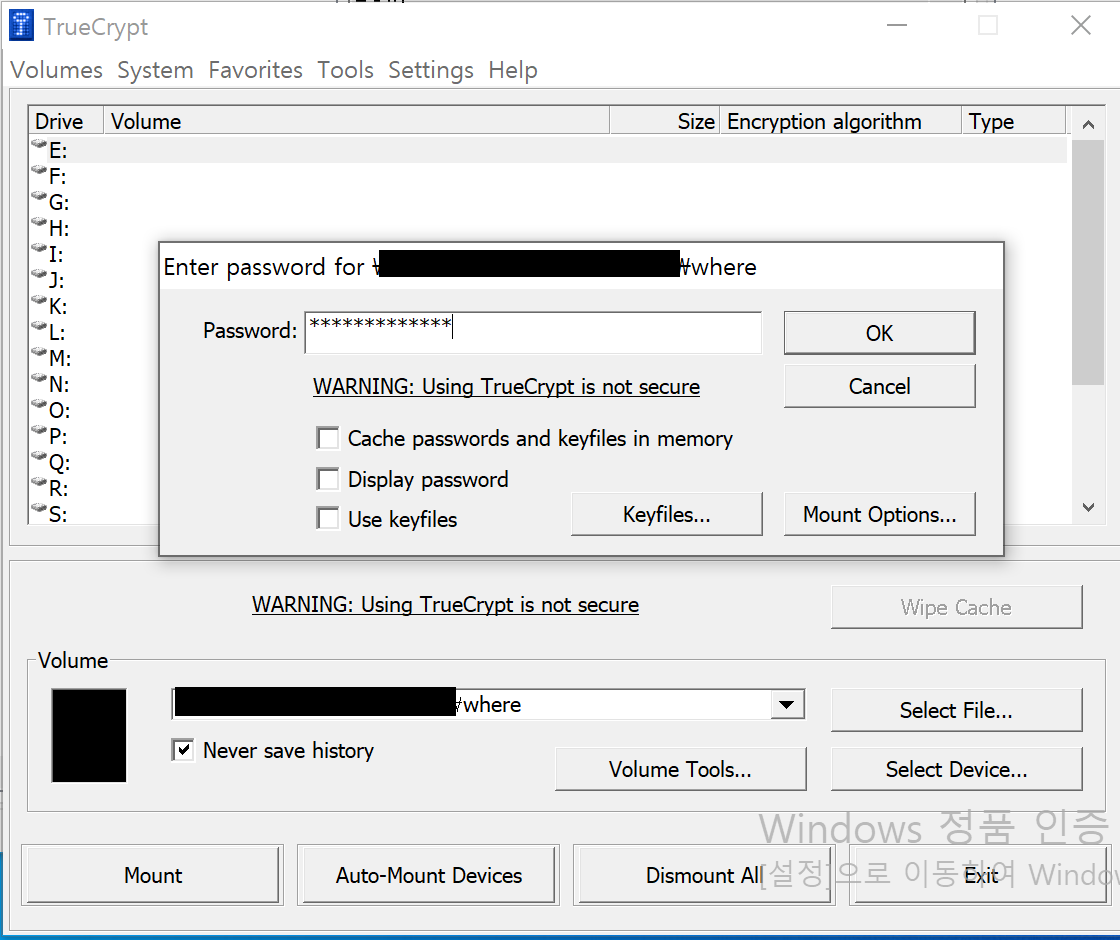 이미 이 파일은 암호화가 되어 있고 이를 주어진 password를 이용하여 mount 시키면 로컬 디스크 드라이브인 것 마냥 이 파일을 읽을 수 있게 된다. 당장 사용해보았다.