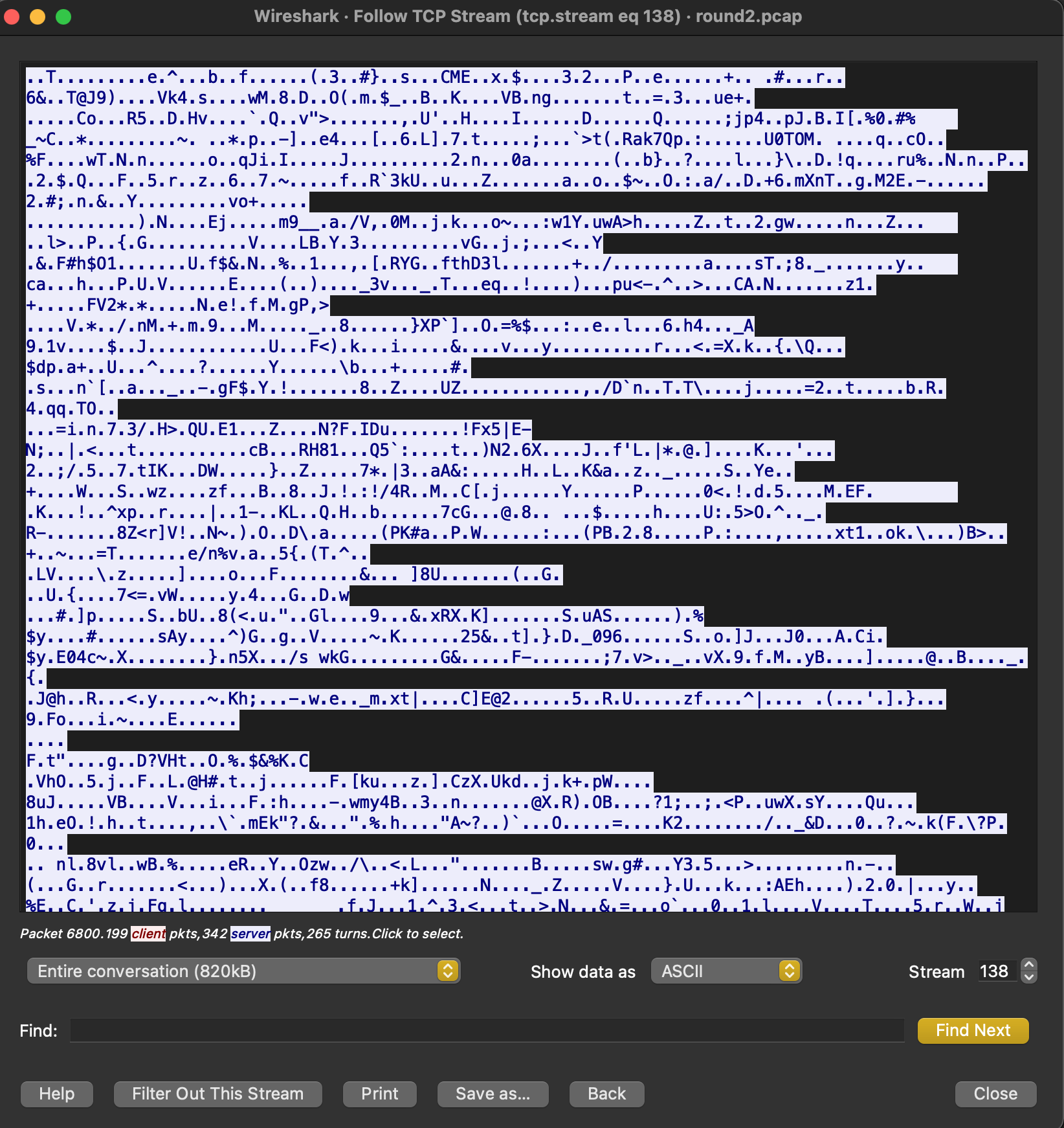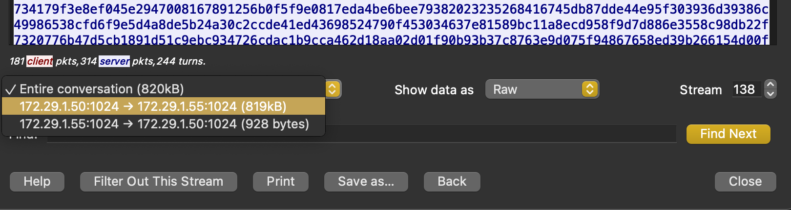 다시 WireShark로 돌아와, 1024 포트에서 Follow Stream 하여 얻은 내용을 파일로 추출하기 위해 Raw 형식으로 바꾼 뒤에 819200 사이즈만큼을 선택하여 저장한다.
