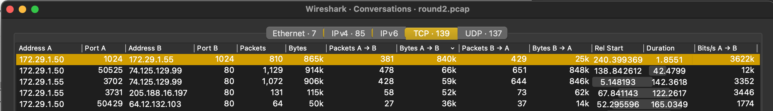 전송된 바이트수를 기준으로 정렬했을 때 192.29.1.50의 1024 포트로 매우 많은 바이트의 통신이 이루어졌음을 알 수 있다.