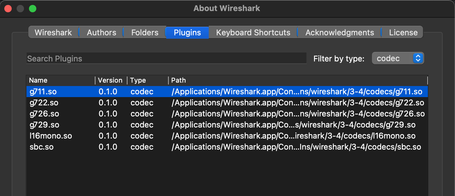 현재 내 wireshark 버전에서 지원하는 코덱이 어떤게 있는지 확인하기 위해 [About Wireshark] - [Plugins] 메뉴에 들어간다.