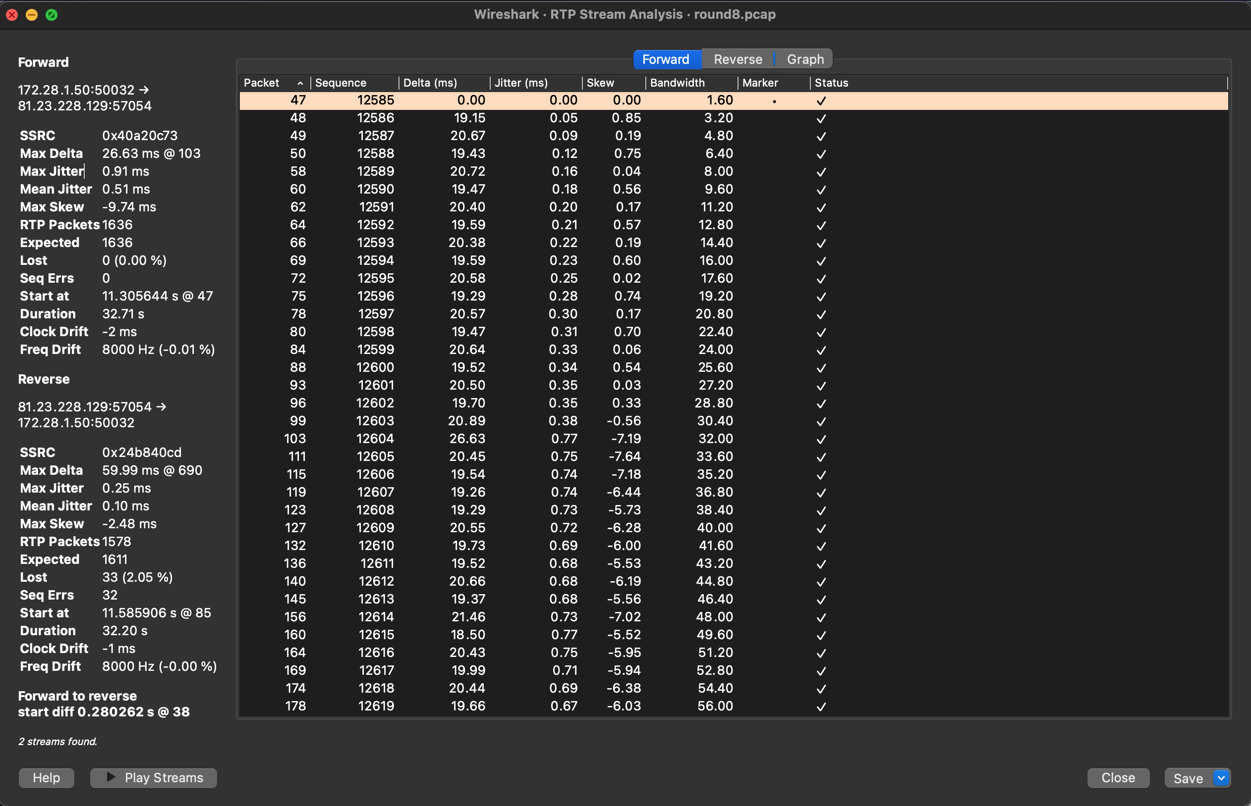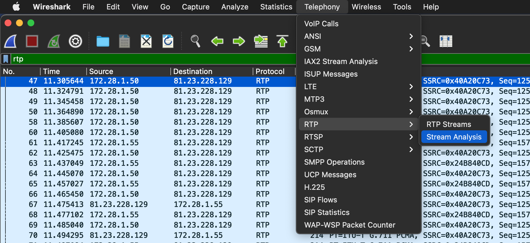 이렇게 RTP Player가 지원되는 코덱의 데이터가 전송된 것을 확인했으므로 RTP Player를 사용하여 데이터의 내용을 확인하면 될 것 같다. 이를 위해 RTP 패킷 하나를 선택한 후 [Telephony] - [RTP] - [Stream Analysis] 메뉴를 선택하여 해당 스트림을 타고 간다.