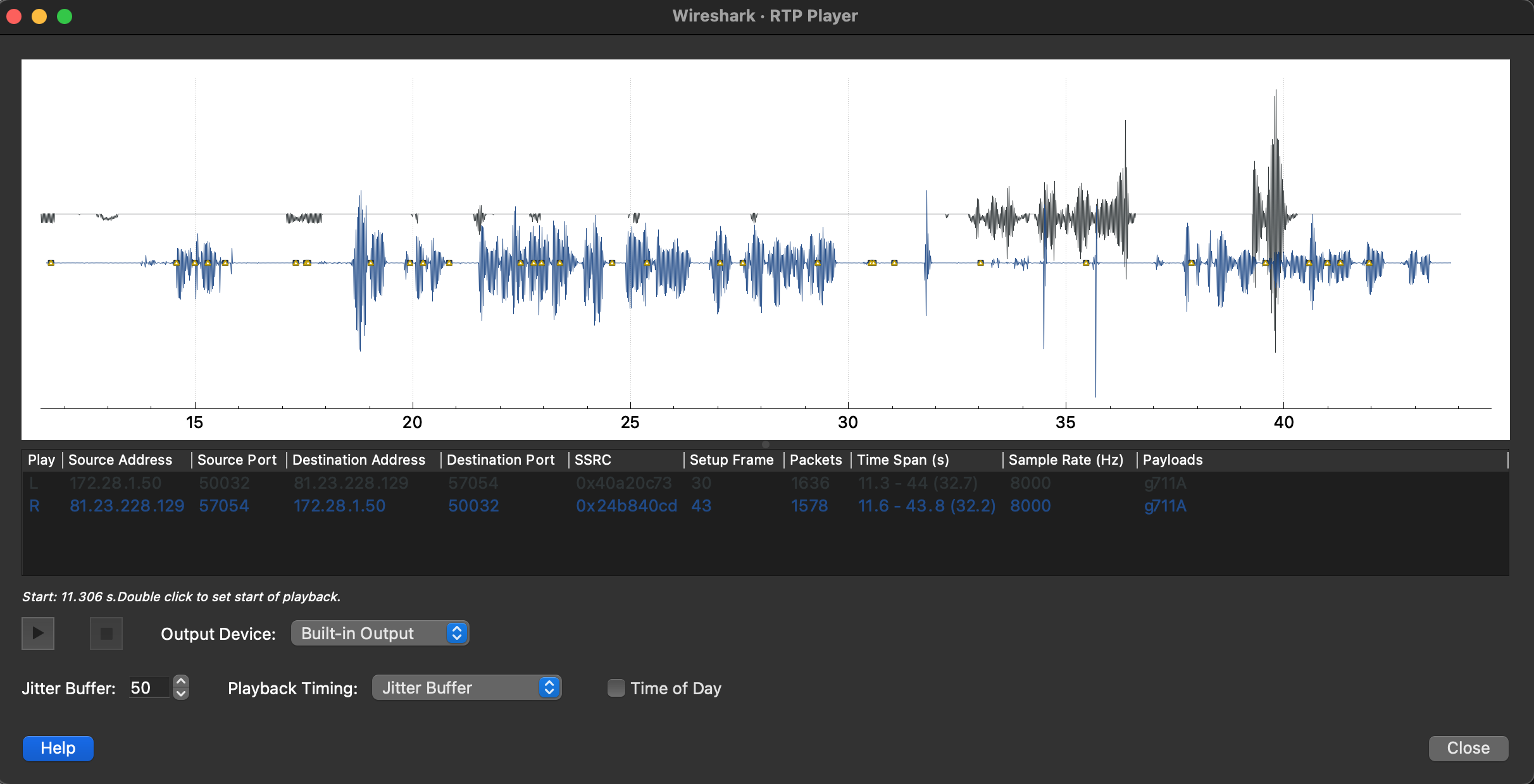 그리고 여기에서 아래 Play Stream 버튼을 누르면 RTP Player가 나오고, 이를 이용하여 RTP 프로토콜로 전송된 음성 데이터를 들어볼 수 있다.