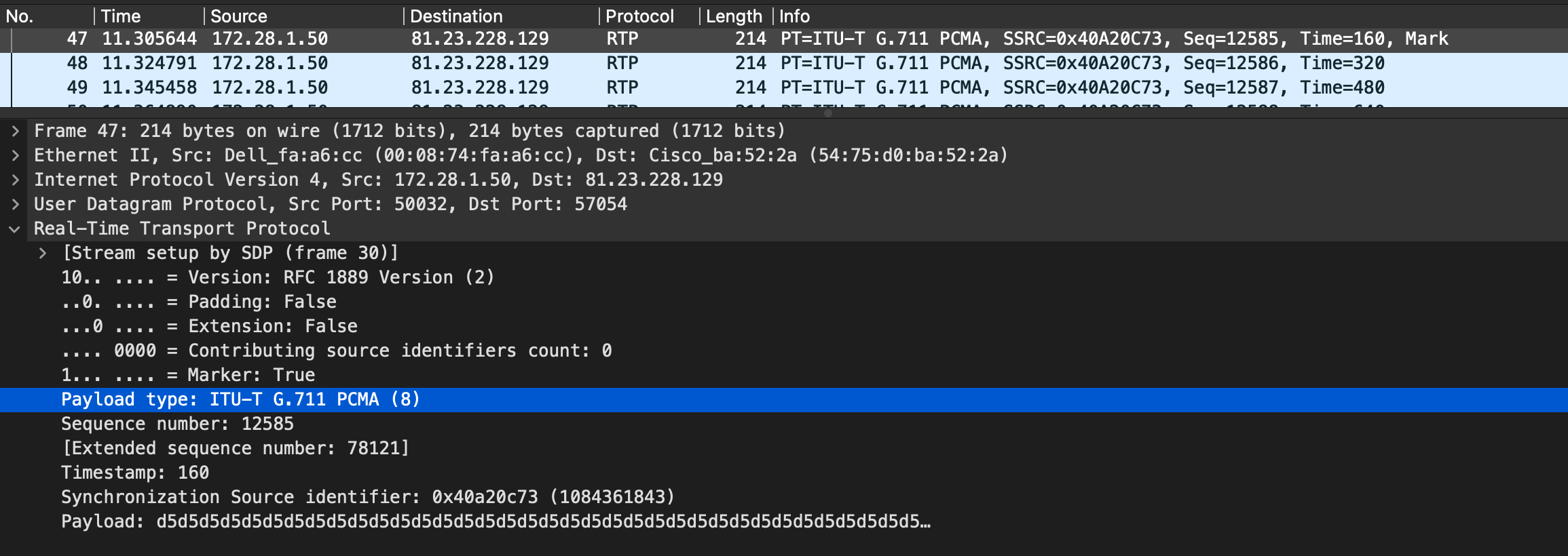 hex dump를 보는게 습관이 되어서 그런지 이 문제를 본 뒤에도 RTP Header format부터 찾은 뒤에 packet hex를 들여다보았던것 같다. RTP 패킷 파일을 선택한 후 해당 패킷의 detail 페이지를 확인해보면 Payload type으로부터 전송된 데이터가 G.711 PCMA으로 된 것임을 알 수 있었다.