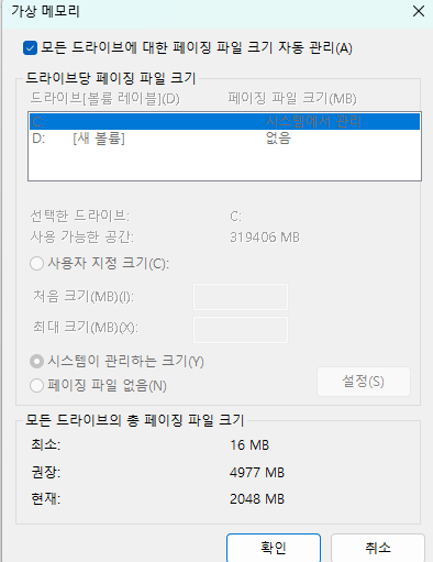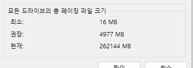 이렇게 만든 원인은 "모든 드라이브에 대한 페이징 파일 크기 자동 관리" 체크 박스가 해제되어 있는 상태였는데.. 이를 체크해두는게 권장사항이라고 합니다.. 별도로 페이징 파일 크기를 커스텀 해주고 싶을 경우 이 체크박스를 풀고 원하는 크기를 설정해주면 됩니다. 이러한 부분은 (https://hkebi.tistory.com/1321) 블로그를 참고했습니다.