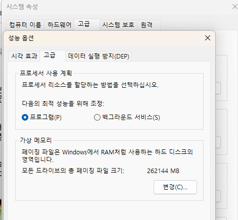 실제로 [시스템 속성] - [고급] - [성능 설정] - [고급] 탭에 들어가보면 가상 메모리 파트가 나오는데 여기서 바로 그 문제의 현상을 목격할 수 있었습니다. 262GB.....한숨 나오네요...