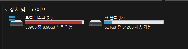 하지만 이 용량도 다시 금방 차올라 결국 D 드라이브 용량 중 140GB를 C드라이브에 연결하는 선택을 하게 됩니다.... 이 선택으로 얼마간은 버틸 수 있겠거니 생각하고 컴퓨터를 다시시작 하는데..?
