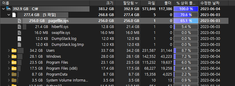 TreeSize 프로그램을 실행하면 아래와 같은 화면이 나오는데, 이 리스트 중 C드라이브를 가장 많이 잡아먹고 있던 파일이 무엇인가??? 찾아보니 pagefile.sys가 혼자서 무려 260GB 가량을 차지하고 있었던 것이었습니다ㅡㅡ 이 파일은 가상메모리 페이징에 사용되는 파일인데, 현재 시스템에서 이 파일의 사이즈를 제한해두지 않아 프로그램 사용 시 마다 계속 페이징된 부분들이 쌓였던 것 같습니다..