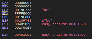 이를 사용하여 다시 확인한 결과, 세번째와 네번째 자리의 문자인 "bc"가 ecx의 값이 되는 것을 알 수 있다.