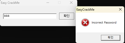 다운로드 받은 파일을 실행해보면 아래와 같은 GUI 프로그램이 실행되는 것을 볼 수 있다. 문자열을 입력 후 확인 버튼을 누르면 Incorrect Password 라는 결과창을 보여준다. 이를 통해, 본 프로그램에서 "Incorrect password"라는 문자열이 쓰인다는 것을 알 수 있다.