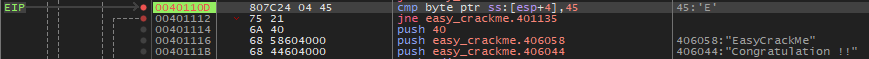 현재까지 조합된 패스워드는 _a5yR3versing 이다. 첫번째 자리의 문자가 미정인 상태이다. 이를 확정짓기 위해서는 네번째 분기 지점인 0x00401112를 확인하면 된다.