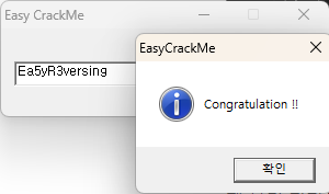 결과적으로, 이것들을 조합한 패스워드인 Ea5yR3versing을 입력하면 다음과 같은 축하 메세지를 얻을 수 있다.