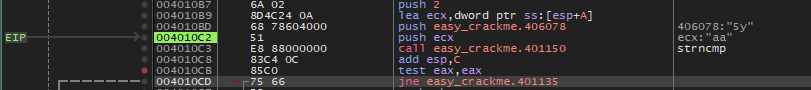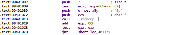 easy_crackme.401150 함수의 심볼이 혹시나 있는지 보기 위해 IDA를 사용하여 이 함수가 위치한 0x004010C3 주소로 이동하면 문자열의 일치 여부를 확인하는 함수인 strncmp임을 알 수 있다. 따라서 앞서 사용된 두 매개변수와 함께 고려하여 생각해볼 경우, 두 번째 분기문의 조건은 입력된 비밀번호의 3번째와 4번째 문자가 "5y"와 같아야만 함을 나타내는 것을 알 수 있다.
