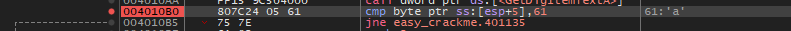 이 위치에서 성공과 실패를 가르는 첫번째 조건은 byte ptr ss:[esp+5]와 61('a') 가 같아야 한다는 것이다.