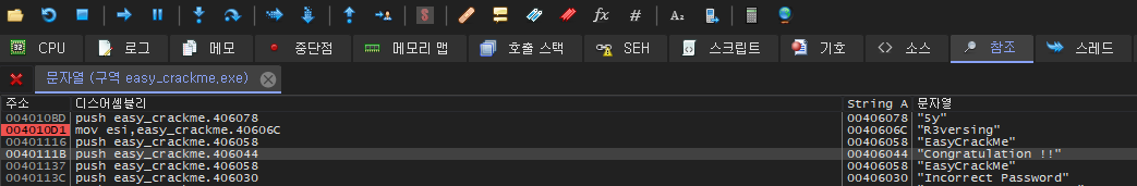 이 상태에서 문자열 검색을 누르면 아까 보았던 Incorrect Password 문자열을 볼 수 있고, 그 위쪽으로 Congratulation !! 이라는 문자열을 볼 수 있다. 올바른 비밀번호를 입력하면 이 문자열이 출력되는 것으로 추정된다.