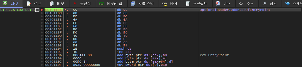 이번에는 x32dbg를 사용하여 파일을 로드하고 실행하여 EntryPoint를 찾는다.