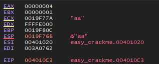 여기서 eax의 값은 0x004010C3에서 호출되는 easy_crackme.401150 의 return 값과 같게 된다. 그렇기 때문에 호출되는 함수가 어떤 결과를 반환하는지 알아야 한다. 이를 위해 우선 인자로 들어가는 값을 보자. 함수가 호출되기 직전에 스택에 push 되는 두 값이 있다. 하나는 프로그램 내에 하드코딩 되어 있는 문자열 "5y"이고, 다른 하나는 입력한 문자열인 dword ptr ss:[esp+A] 이다. esp+A가 가리키고 있는 값이 무엇인지 확인하기 위해 콜스택을 확인해도 되지만 이번에는 이 값이 ecx에 들어있으므로, ecx에 저장된 값을 통해 확인한다.