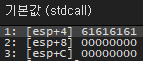 테스트로 입력해둔 값은 'aaaa' 인데, 마치 입력한 값을 가리키듯 스택에 들어있는 값 또한 61 61 61 61 (aaaa)을 가진다.