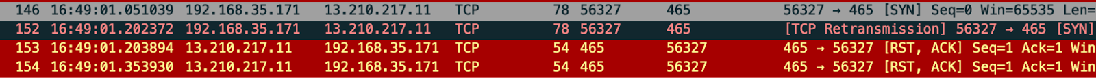 연결 성공 시 TCP 3-way handshake에 성공하며 그 이후 암호화 통신을 사용하여 데이터를 교환한다. [그림 1] 그러나 연결에 실패할 경우 서버로부터 TCP RST 패킷을 반환 받는다. [그림 2]