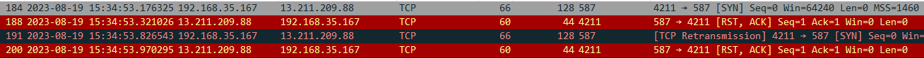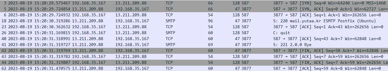 [그림 1]은 SMTP 서버가 동작 중일 경우에 해당하며, 정상적으로 TCP 3-way handshake를 맺은 후 SMTP 연결을 위한 메시지를 교환하는 것을 확인할 수 있다. [그림 2]는 SMTP 서버가 동작 중이지 않을 경우에 해당하며, TCP SYN 패킷에 대한 응답으로 TCP RST 패킷이 반환되는 것을 볼 수 있다.