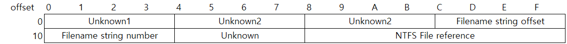 이러한 필드를 제외한 채, Filename string offset과 Filename string number 필드값을 이용하면 각 entry에 해당하는 파일명을 찾을 수 있다. 다음은 Windows 10 환경의 프리패치 파일에서 직접 entry 내 파일명을 확인하기까지의 과정이다.