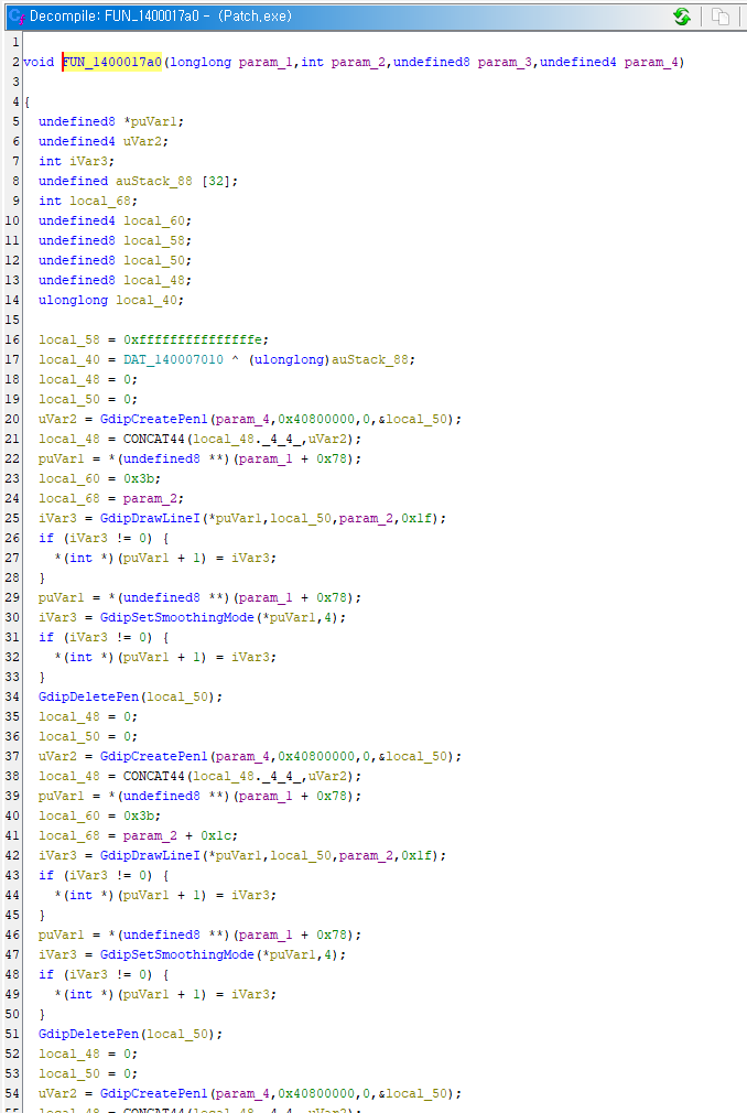그 중 FUN_140002b80 함수 이후로 가장 처음 나타나는 FUN_1400017a0 함수는 다음과 같이 여러 차례의 GdipCreatePen1 - GdipDrawLineI - GdipDeletePen 과정을 가지며, 여러 선을 그리고 있는 것으로 추정된다.