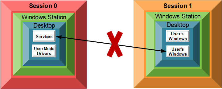 이러한 문제를 해결하고자,그리고 세션 0에서 실행되는 서비스들은 상호작용 대상에서 제외시켰다. 이로 인해 더이상 서비스들은 다른 세션에서 실행되는 사용자 애플리케이션과 상호작용 할 수 없게 되었으며, 동시에 사용자 애플리케이션에 포함된 악성 코드로부터 보호되었다. 모든 서비스들과 user-mode 드라이버들은 세션 0에서 실행되도록 분리시키고, 사용자 세션은 세션 1 이후의 세션에서 실행되도록 하였다.
