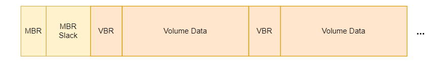 VBR은 각 볼륨이 시작될 때 한번씩 위치하는 부분이다. VBR은 해당 볼륨에 액세스 하기 위한 정보를 가지고 있는데, 여기에는 파일 시스템 타입, 부트 코드, 에러 메세지 등이 포함된다. MBR의 파티션 테이블을 통해 부팅 가능한 파티션에 접근하게 되고, 그 후 VBR이 실행된다.