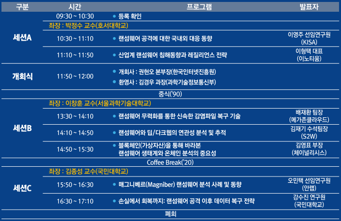 평소 랜섬웨어에 대한 사전 대응책으로는 데이터 백업을, 사후 대응책으로는 랜선 뽑기만을 알고 있었다. 그런데 이것으로 컨퍼런스를 개최한다는 부분에서 내가 모르는 다른 기막힌 대응책이 있는 것일지에 대한 궁금증이 생겼다.