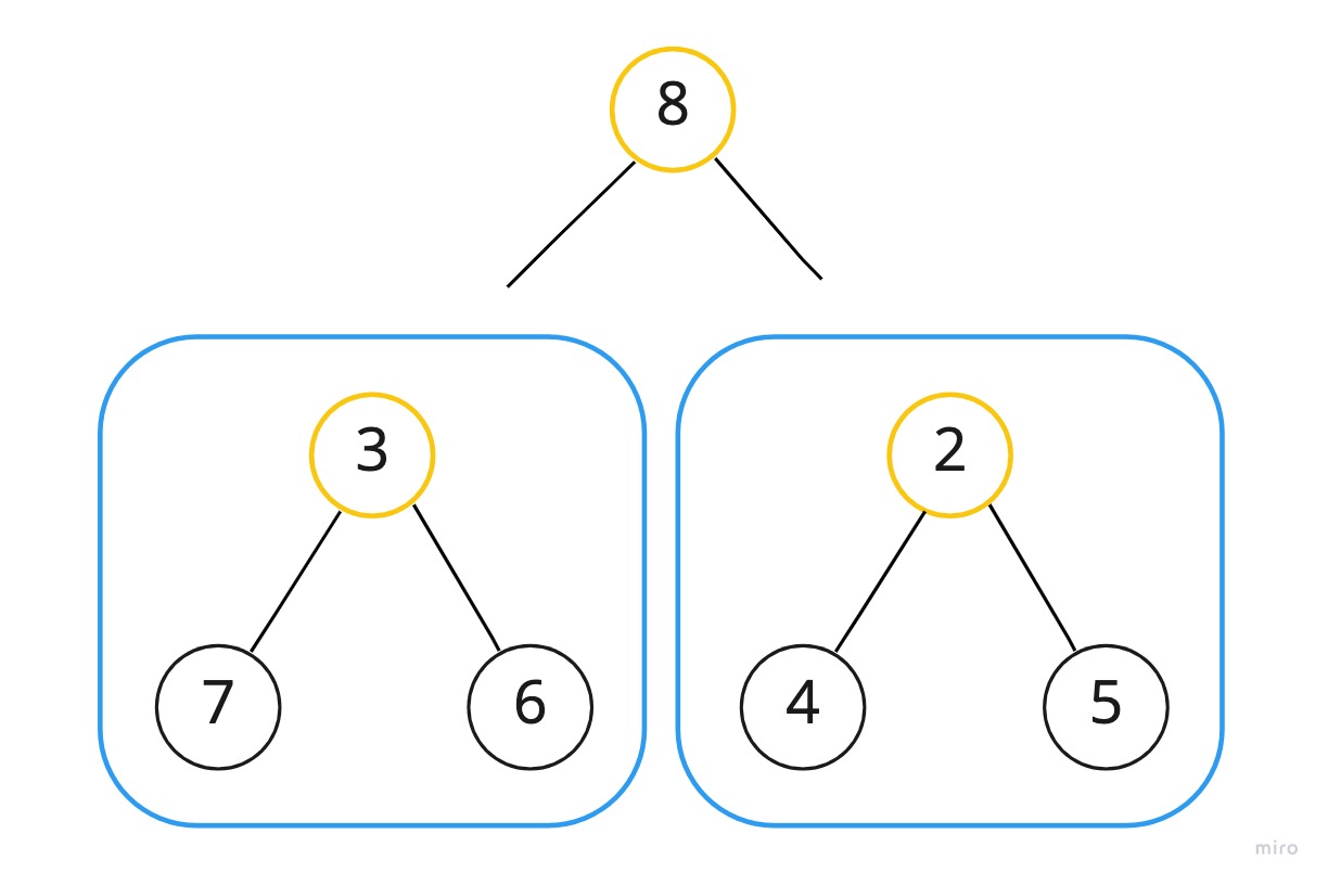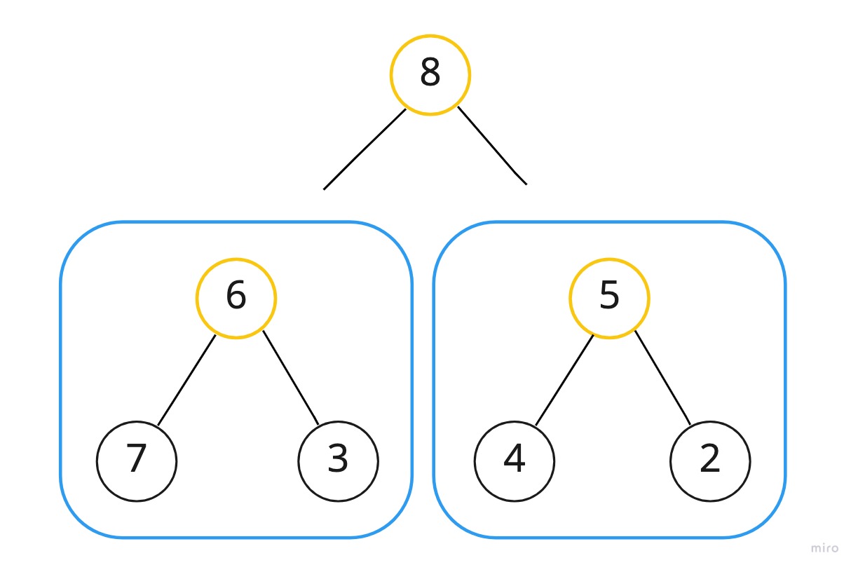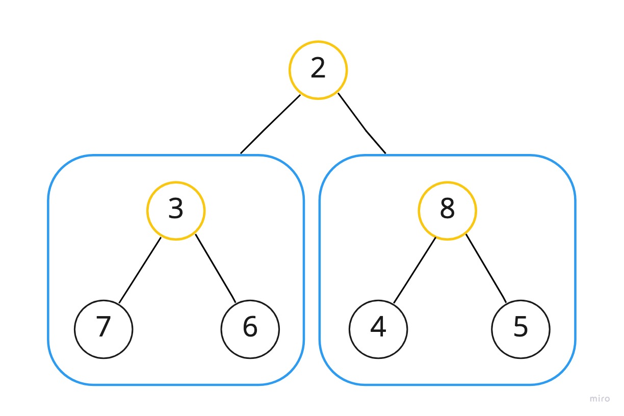 합칠 두 부트리가 준비되었으므로 8을 기준으로 하여 다시 한 번 downHeap을 수행한다.
