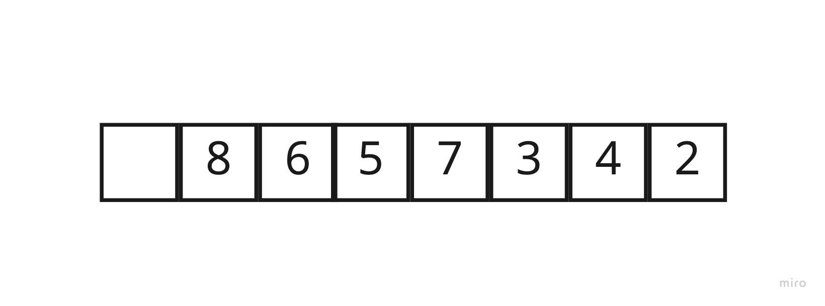 이 과정이 이해가 되지 않는다면 아래와 같이 배열을 그린 뒤에 역방향(최소힙이라면 내림차순, 최대힙이라면 오름차순)으로 정렬된 데이터를 넣고 swap이 이루어질 때마다 하나씩 색칠해가면서 과정을 이해해보자. 이미 색칠이 되어있는 자리는 더이상 색칠할 일이 없거나 혹은 한 번 더 색칠하게 된다고 하더라도 그것이 겹치는 횟수만큼 다른 곳에 접근이 이루어지지 않은 원소가 존재할 것이다.