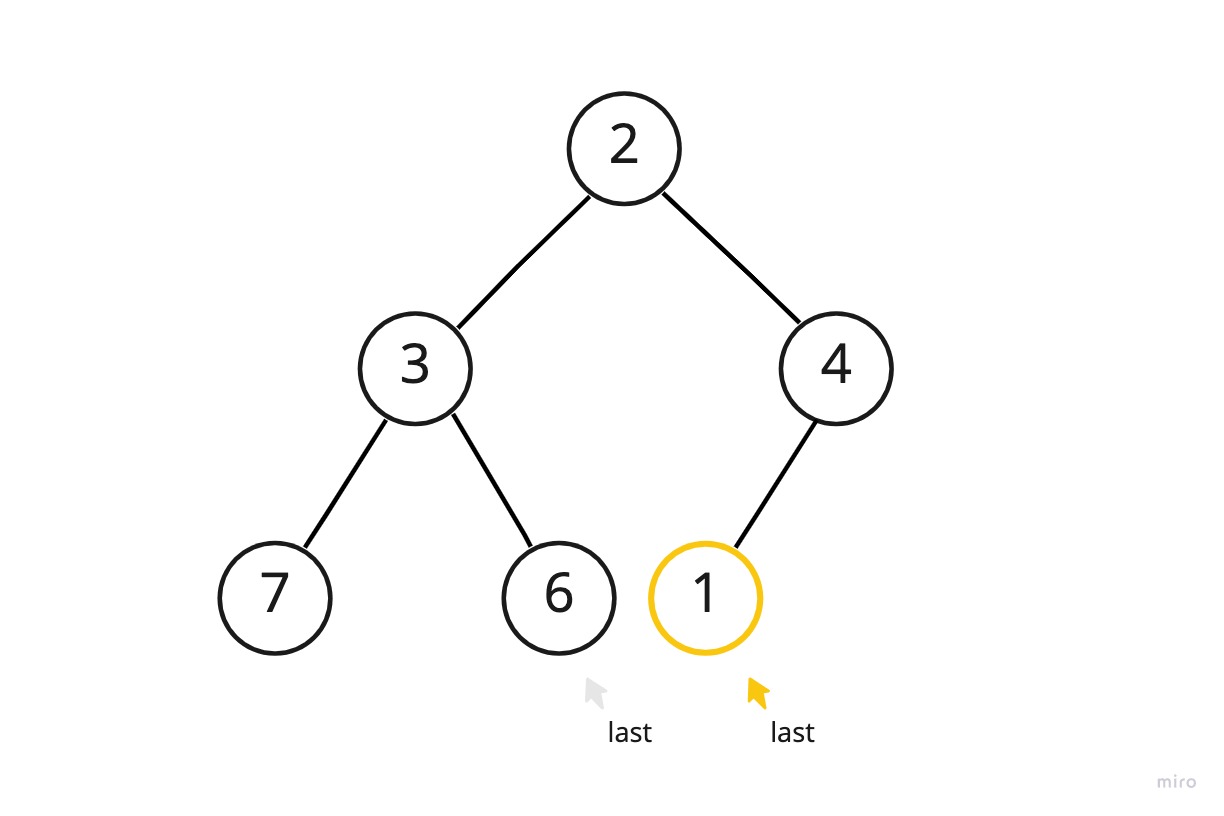 1이 추가되기 이전까지 last는 6을 가리키고 있었는데 데이터 추가를 위해 레벨 순위 상 다음 위치인 4의 왼쪽 자식 위치를 가리키도록 변경된 것이다. (단계1) 그리고 변경된 last 위치에 1을 넣었다. (단계2)