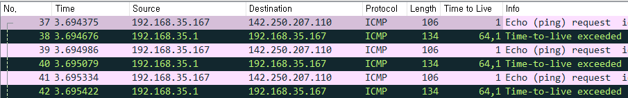 - 첫번째 라우터에서 TTL값이 0이 된 패킷은 폐기되고 송신자에게 시간 초과 ICMP 메시지를 전송한다.