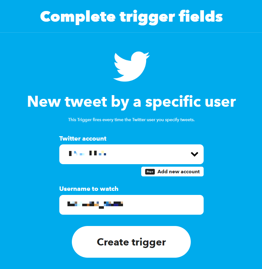 그럼 이 Twitter가 어떤 조건을 만족할 경우에 대한 이벤트 설정을 할 것인지 고를 수 있는 메뉴를 선택한다. 원하는 조건에 따라 선택하면 되겠지만, 여기서 나는 특정 인물의 트윗을 구독하고자 하는 것이기 때문에 이 중 "New tweet by a specific user"를 선택한다. twitter의 경우 최근 트위터 정책이 변경됨에 따라 이를 스크랩하는 것이 유료버전으로 바뀐 것 같다. 물론 나는 이를 위해 프로 구독을 했다..ㅠ