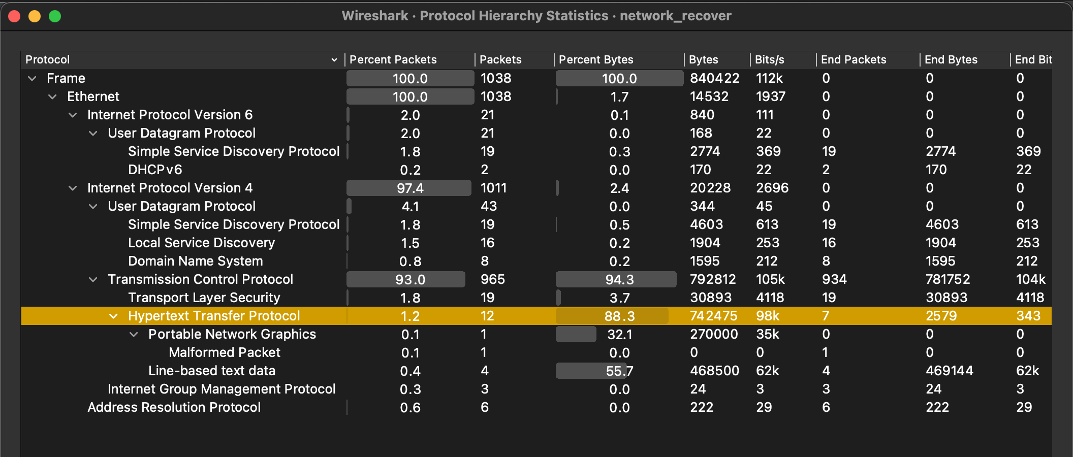 현재 이 파일 내에 잡힌 패킷들에 어떤 프로토콜이 얼마나 많이 쓰였는지를 한눈에 파악하기 좋기 때문이다.