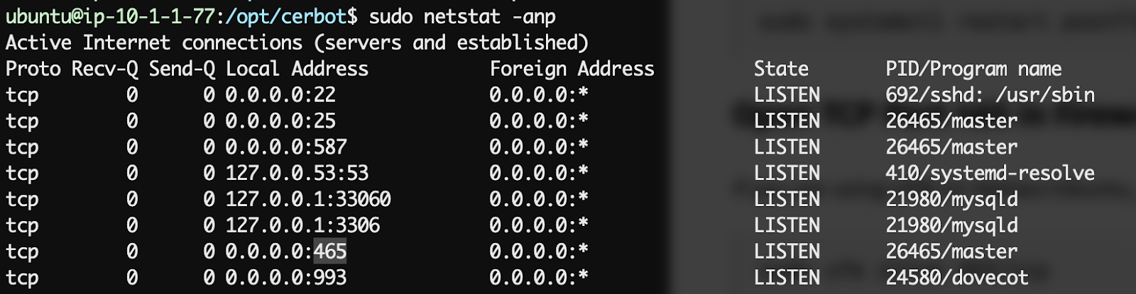 이렇게 서버 구축을 하고 나면 기본적인 SMTP 메일 서버로의 기능을 사용할 수 있다. 그러나 이 상태에서 서버의 네트워크 연결 상태를 확인하면 465번 포트는 활성화되어 있지 않을 것이다. Postfix에서는 465번 포트를 활성화시키기 위해 별도로 설정 파일을 수정해야 한다. 이에 대한 과정도 참고할 수 있도록 링크를 남겨둔다. 이 과정까지 마치면 비로소 465번 포트를 이용하여 SMTPS 통신을 수행할 수 있게 된다.