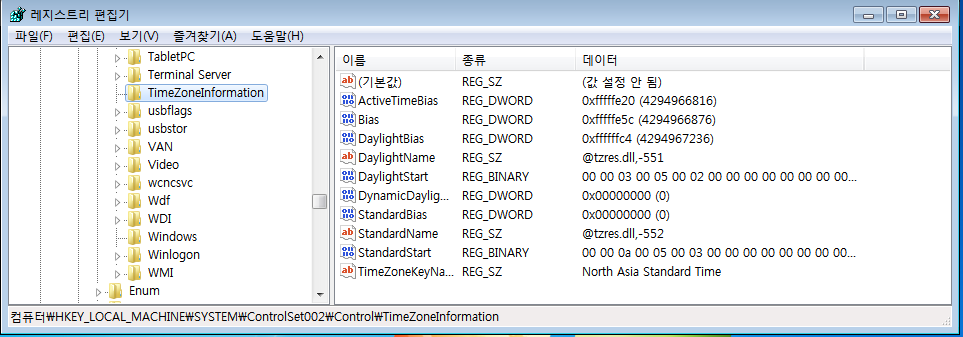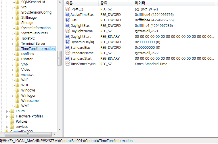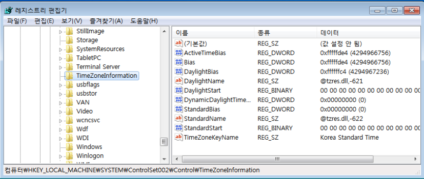 그 후 차례로 CurrentControlSet과 ControlSet001, 그리고 ControlSet002의 표준시간대 반영 결과를 확인하였다.