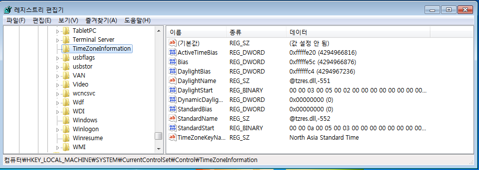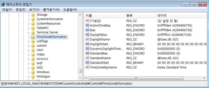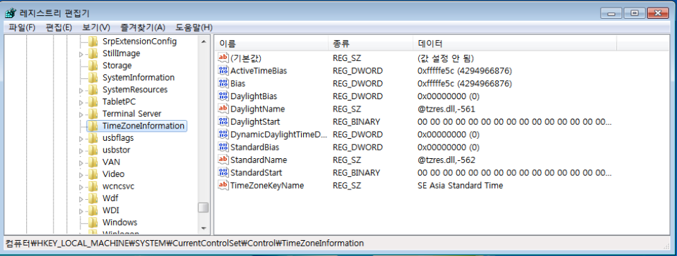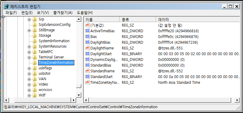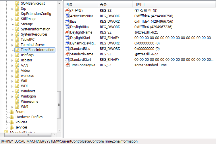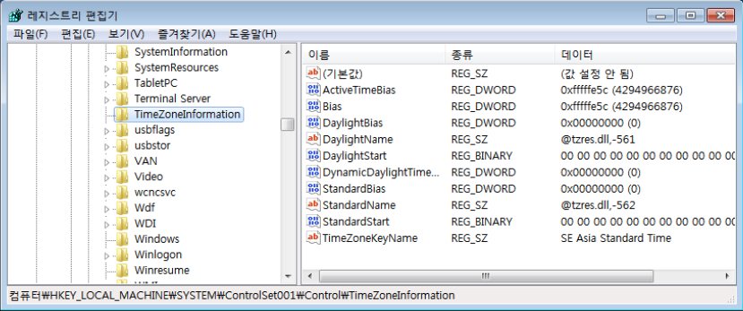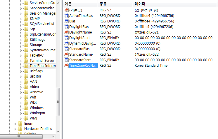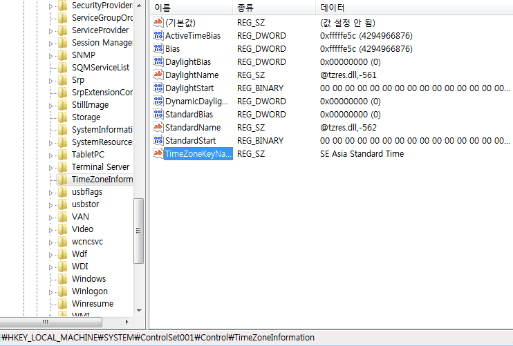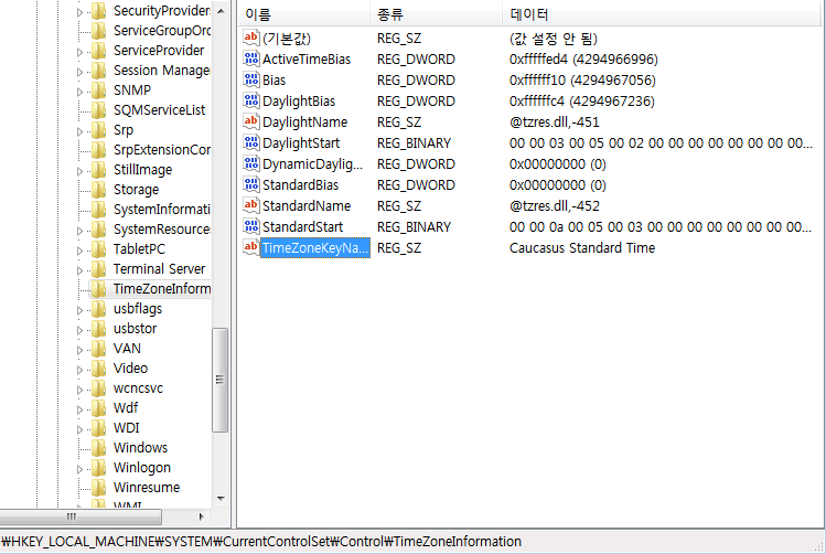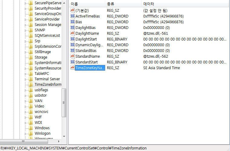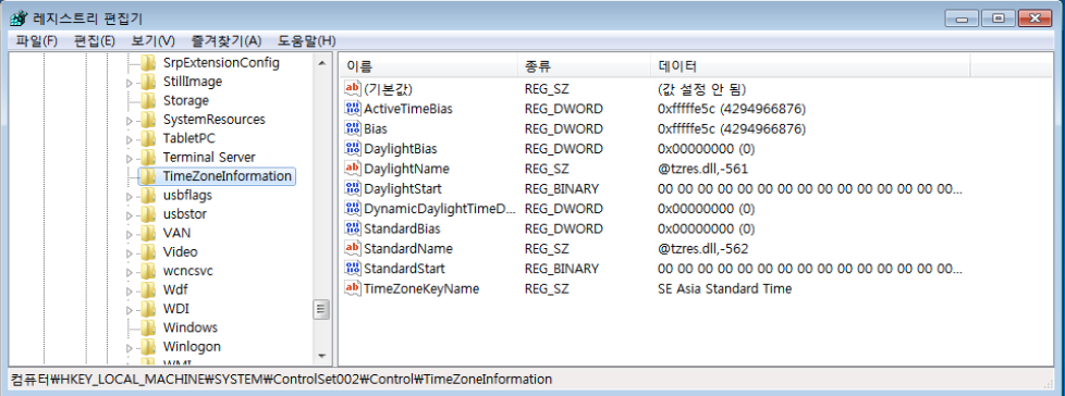 Windows Registry 내에서 시스템의 Timezone을 확인하기 위해서는 다음과 같은 키의 값을 확인하면 된다.