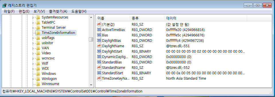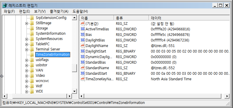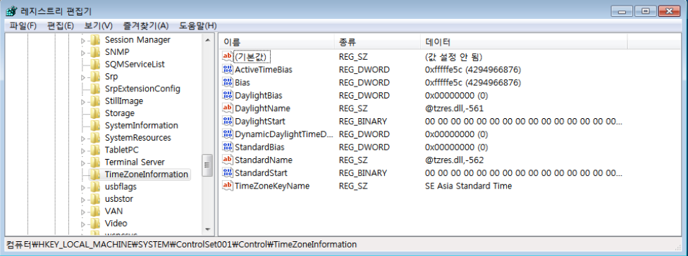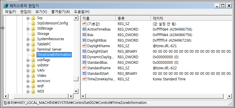 그 후 차례로 CurrentControlSet과 ControlSet001, 그리고 ControlSet002의 표준시간대 반영 결과를 확인하였다.