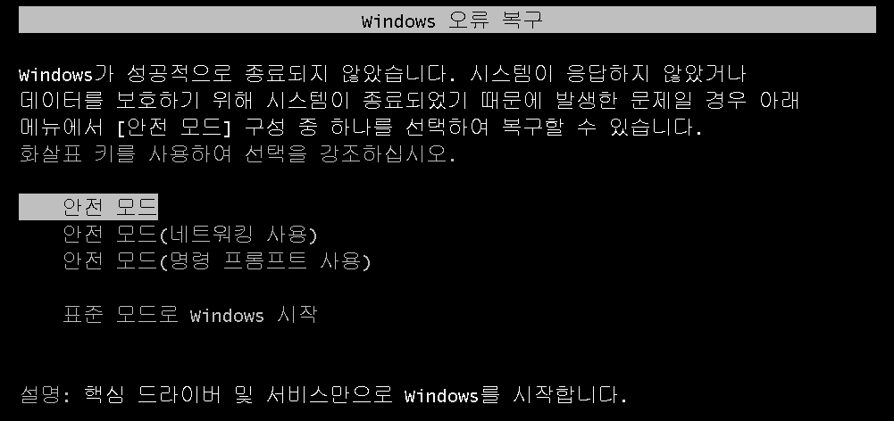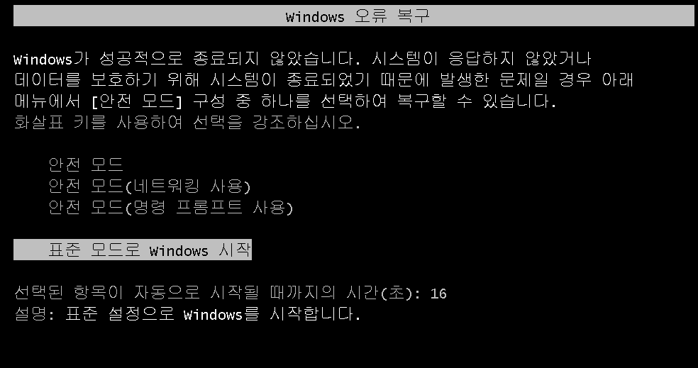 여기서 만약 안전 모드가 아닌 표준 모드로 재부팅을 한다면?