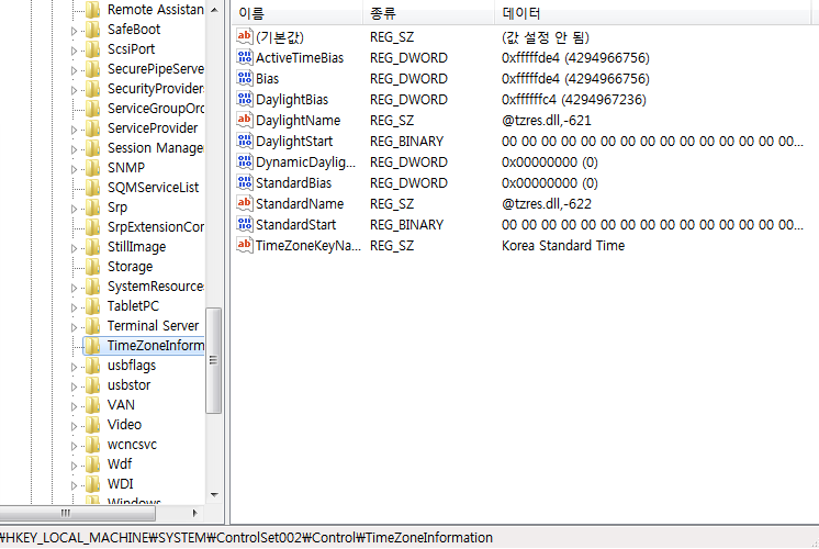 비정상적으로 종료된 케이스에서도 정상적으로 재부팅을 한다면, ControlSet002의 시간대도 다시 시스템의 표준 시간대와 동일한 값을 가지는 것을 확인하였다.