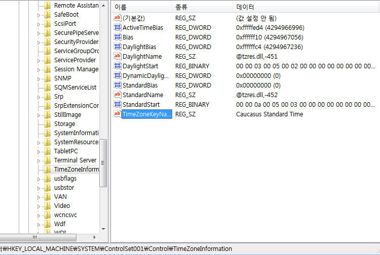 이름이 비슷하게 생긴 것을 힌트 삼아 이 두 경로가 CurrentControlSet을 대신할 수 있을까 라는 생각을 하게 되었다. 그리고 실제로 각각의 경로를 탐색한 결과 두 경로 모두 현재 시스템의 시간대 정보를 가지고 있는 것을 확인할 수 있었다.