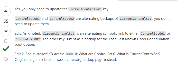 그렇다면 CurrentControlSet을 사용하지 않고 ControlSet001을 사용하면 되는것 아닌가? 라는 의문이 들 수 있다.