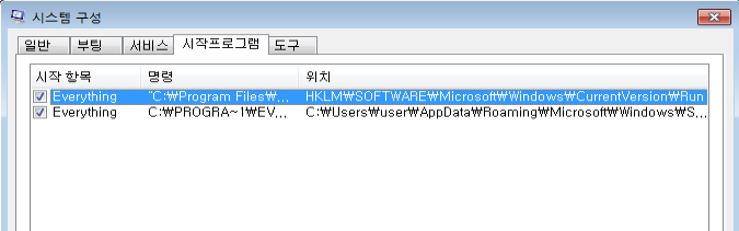 Windows 7에서는 시스템 구성 창의 [시작 프로그램] 탭에서 설치한 프로그램에 대해 두 가지 항목을 기록하고 있는 것을 볼 수 있다.